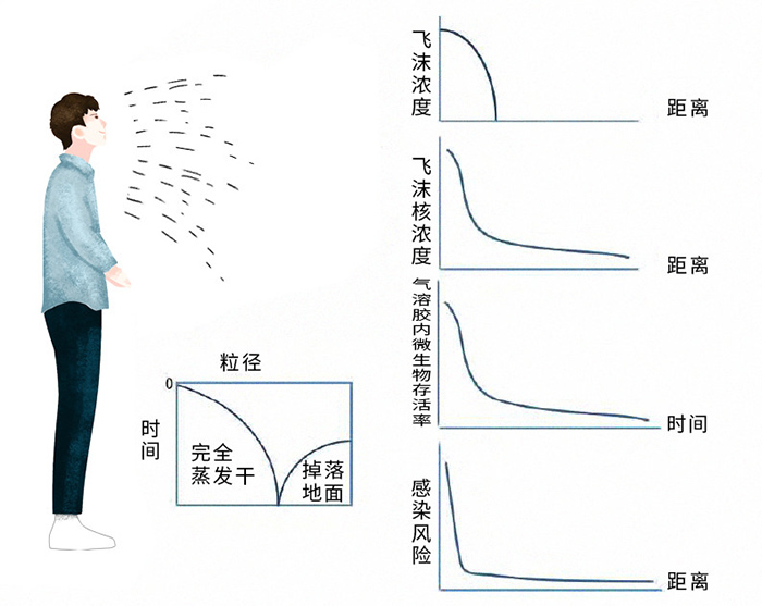 可能大家都有过这种经历:走在楼道里甚至路上,明明周围几十米之内都没有人,但仍然可以闻到烟味。我们闻到的就是烟草燃烧后形成的几百纳米左右的颗粒。越小的颗粒,空气的粘性作用就越明显。微米级的颗粒在空气中像是芝麻撒在蜂蜜里,几乎不下沉。定量来说,静止空气中同一高度的小颗粒停留时间跟其表面积成反比。对于1微米的颗粒,在静止空气中沉降时间为1小时以上。而环境中总有风吹草动,于是这些颗粒几乎永远不会沉降,始终停留在空气中。这也是为什么抽烟的人可能早已经消失不见,但余味还久久不散。这种在气体中稳定分散悬浮的液态或固体小颗粒叫做气溶胶(aerosol)。之所以翻译为 “胶”,大约就是取颗粒与媒介之间黏黏糊糊、难分难舍之意。含有新冠病毒的飞沫核尺寸就在亚微米到微米的范围,与烟草燃烧后的颗粒尺寸类似。因此,飞沫核在空气中可以悬浮很久,并且在空气中湍流的推波助澜下飘移到远方。飞沫核中的冠状病毒有蛋白质膜壳的保护, 可以在相当长的时间内保持活性。若是被人吸入体内,就有可能导致感染新型冠状病毒。
