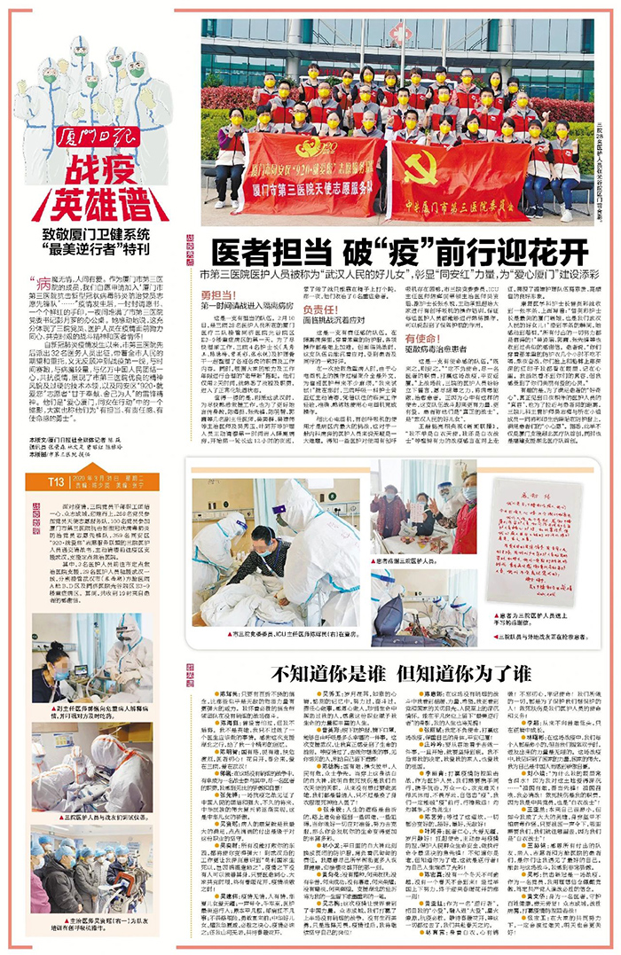 在救治一线,他们展现了市第三医院优良的精神风貌及过硬的技术本领,展现了三院人在疫情面前勠力同心、共克时艰的战斗精神和医者情怀,以及同安区“920•就爱您”志愿者“甘于奉献、舍己为人”的雷锋精神,他们是“爱心厦门,同安在行动”中的一个缩影,大家也称他们为“有担当、有责任感、有使命感的勇士”。