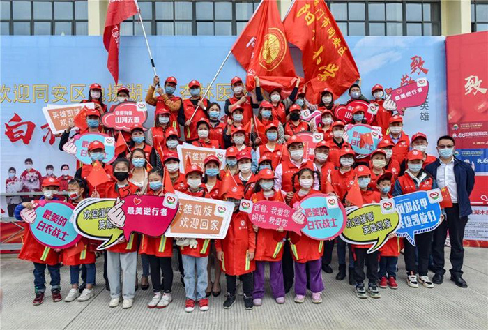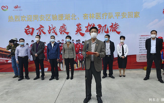 同安区委书记王雪敏,区委副书记陈高润,区委常委、宣传部长林国财,副区长曾繁振,区委组织部副部长郑志献、区委文明办主任林拥护、区卫健局局长陈再进、同安区总工会常务副主席洪明理、市第三医院领导班子、部分职工代表及家属代表在现场,迎接英雄凯旋。欢迎仪式由副区长曾繁振主持。