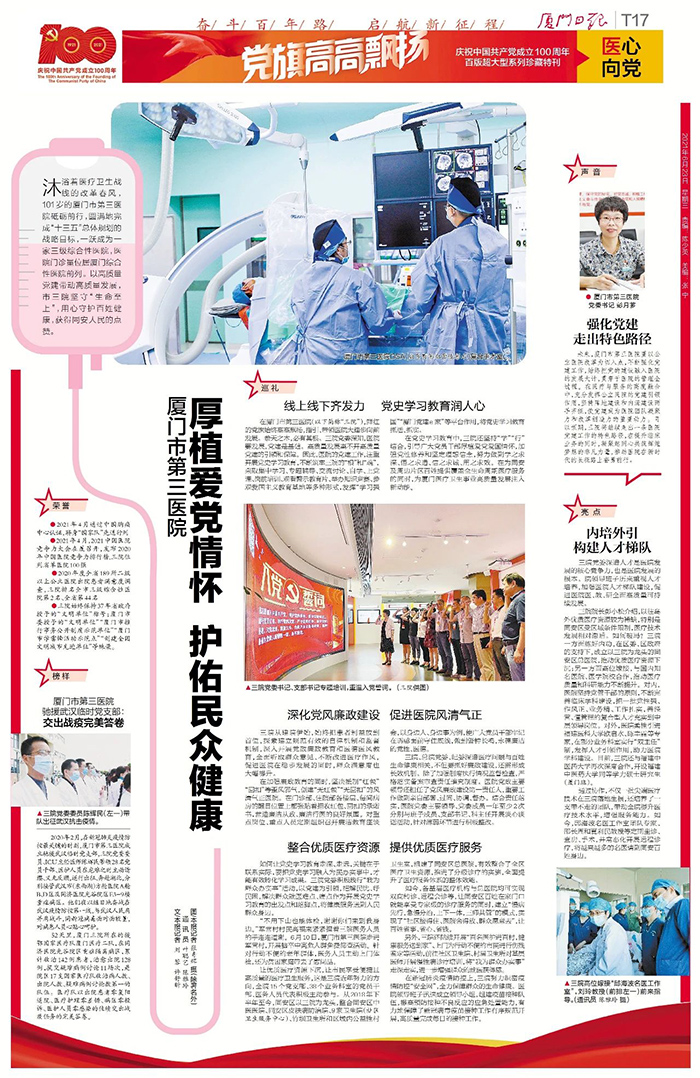 在党史学习教育中,三院还坚持“学”“行”结合,引导广大党员干部厚植爱党爱国情怀,加强党性修养和坚定理想信念,努力做到学之求深、悟之求透、信之求诚、用之求效。在为同安及周边片区百姓提供覆盖全生命周期医疗服务的同时,为厦门医疗卫生事业高质量发展注入新动能。