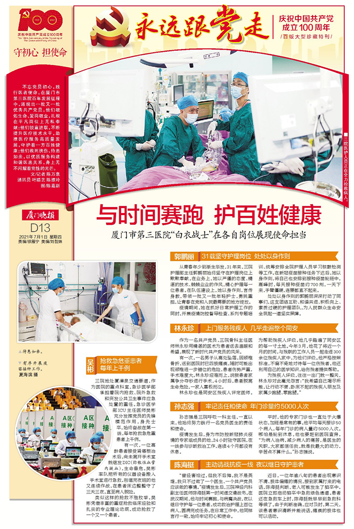 骨科主任医师林永珍用精湛的医术,过硬的本领,为患者送去温暖阳光,用充足的工作干劲,彰显了新时代的共产党员风采。 此前,一名患者从高处坠落送到第三医院抢救,患者因颈椎骨折,四肢已瘫痪,随时可能出现颈椎进一步错位,加重脊髓损伤,情况十分危急。由于患者伤势严重,手术操作难度大,稍有不慎损伤脊髓,后果不堪设想。面对该情况,林永珍迎难而上,说服患者家属,争分夺秒进行手术,4小时后患者脱离生命危险,一家人喜极而泣。 林永珍也是同安区残疾人评定医师。为帮残疾人评级,他几乎踏遍了同安区的每一寸土地。今年3月,他花了将近一个月的时间,与残联的工作人员,走进300余名残疾人家中,为他们评级。他严格按照残疾人等级评定的标准,冷静客观、不偏不倚地对待每一位伤残者,为残疾群众提供信息采集和评残服务。作为一名党员,他也利用自己医学知识,给伤残者提供帮助。 残疾人评级工作,往往一出门就是一整天的奔波,林永珍却毫无怨言,“希望自己竭尽所能让行动不便、卧床不起的残疾群众及家属少跑腿、零跑腿。”