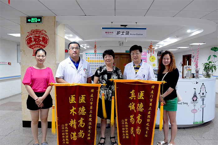 ,为表达感激之情,今天她特地为神经外科郭之通主任,陈金龙医师送来锦旗。