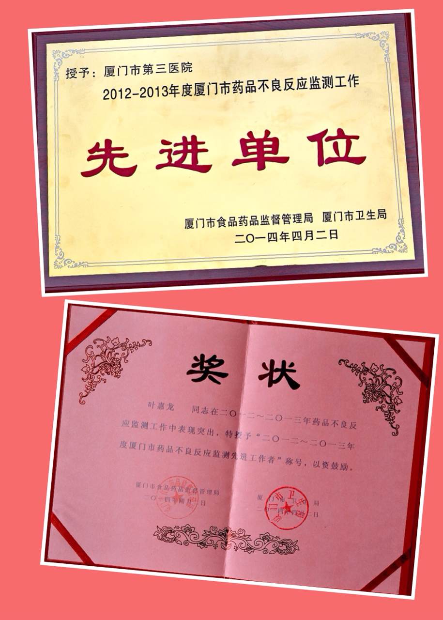 2014年4月2日,跳蛋视频 被厦门市食品药品监督管理局、厦门市卫生局授予“2012-2013年度厦门市药品不良反应监测工作先进单位”称号,同时授予叶惠龙、李军两位同志“2012-2013年度厦门市药品不良反应监测工作先进个人”称号。