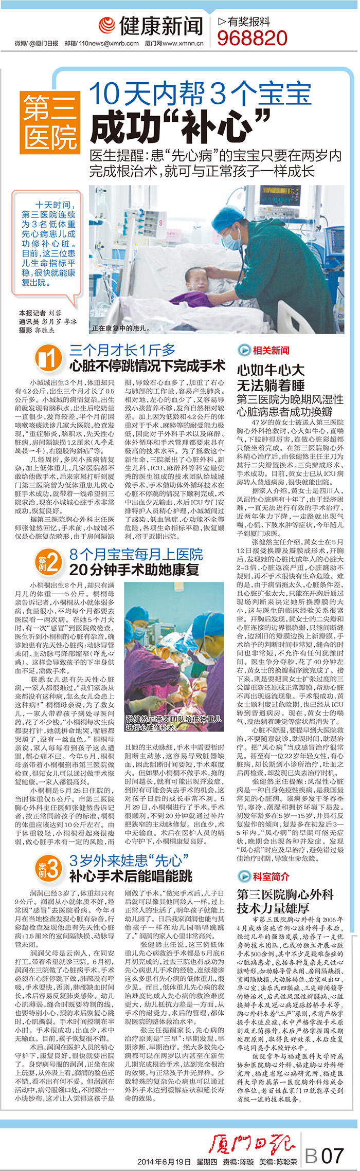 市第三医院胸心外科自2006年4月成功实施首例心脏外科手术后,经过几年的强劲发展,培养了一支雄厚的优秀技术团队,已成功独立开展心脏手术500余例,其中不少是疑难杂症的心脏病患者。包括各种复杂先天性心脏畸形如动脉导管未闭、房间隔缺损、室间隔缺损、大动脉转位、右室双出口、单心室、法乐氏四联症、三尖瓣闭锁等的矫治术,后天性风湿性瓣膜病、心脏换瓣手术及冠心病冠脉搭桥手术等。胸心外科本着“三严”原则,术前严格掌握手术适应症,术中严格掌握手术原则及无菌操作,术后严格掌握围术期处理原则,取得良好效果,术后康复率达同类手术较好水平。该院常年与福建医科大学附属协和医院胸心外科、福建胸心外科研究所、福建省冠心病研究所、福建医科大学附属第一医院胸外科结成合作单位,老百姓在家门口就能享受到省级一流的技术服务。