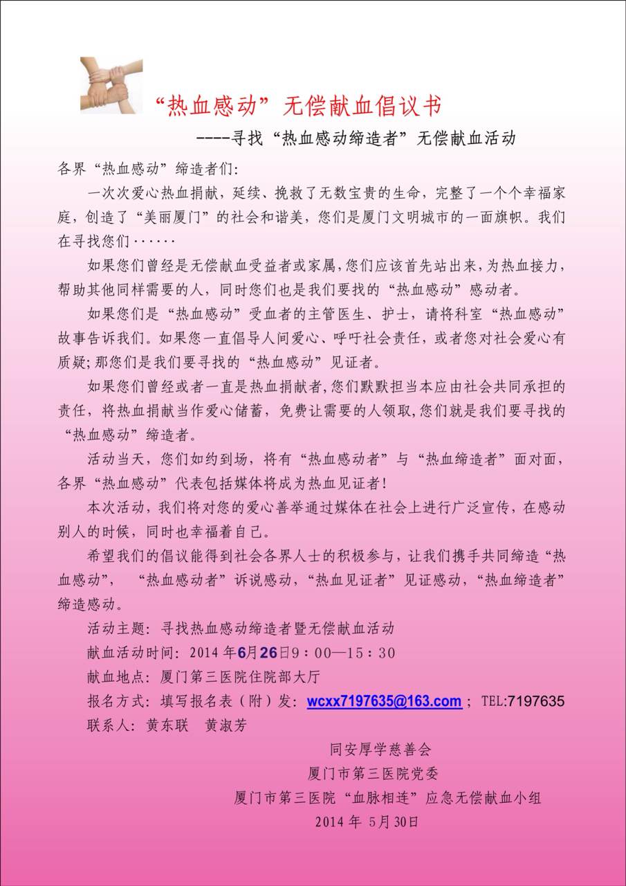 6月26日上午9点,由同安区卫生局、同安厚学慈善会、厦门第三医院联合举办的“热血感动缔造者”无偿献血活动在第三医院住院部大厅如期举行,届时厦门日报、厦门晚报、海西晨报、同安电视台等媒体将作为见证者,欢迎广大爱心人士前来参加。
