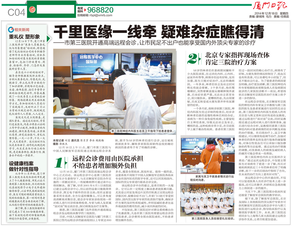 与中国人民解放军总医院通过高端远程会诊系统,联手为58岁的林老伯进行会诊,让这位困扰多年辗转多家医院治疗始终没得到确切病因的林老伯终于有了明确的诊断。