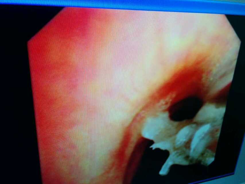 不过,闲聊中,施女士说起的一件事,引起了市第三医院呼吸一科主任孙志强的注意。施女士回忆,正月初三那天,她正在吃一块带鱼鱼头,“吃着吃着,好像有东西突然就滚进喉咙里,一下子咳得很厉害。”她说,不过,后来吃东西也都正常,她就没有在意,就是从那以后,开始咳嗽不停。到现在已经咳了快一个月了,施女士的女儿颇为孝顺,把她带到了三院。