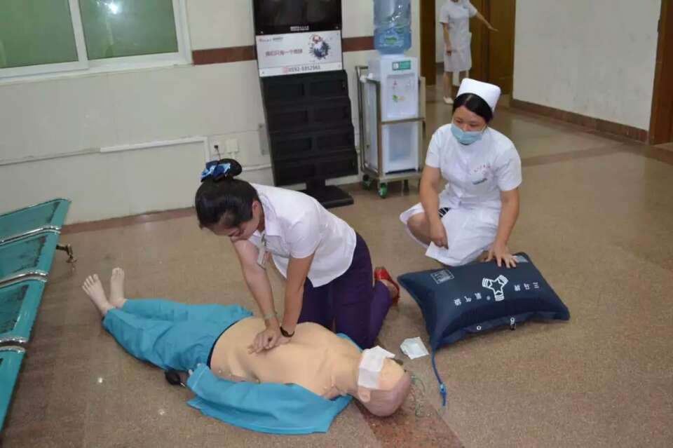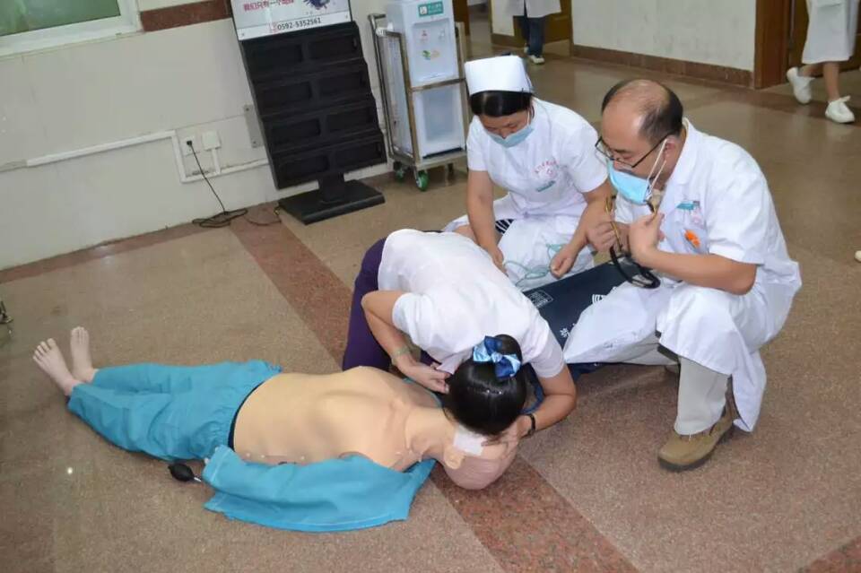 下午17:00,一名“患者”在内科候诊区候诊时,突发晕倒在地上,内科通道分诊台导诊员发现后立即冲上前去,迅速查看病员、判断病情,发现患者心肺骤停立即行心肺复苏术,并呼喊就近诊室医护人员投入抢救,呼吸科吴医生及注射室林护士听到呼喊后立即赶到现场,帮忙给氧、建立静脉通路,同时让其他人员帮忙打急诊科抢救电话(7197995),并报告护士长、医务部。2分钟后护士长、医务部主任赶到现场,医务部主任现场指挥抢救,随后急诊科抢救小组携带抢救物品及平车也赶到现场共同抢救,急诊科医生接手继续进行复苏抢救,给予简易呼吸器辅助呼吸。5分钟后“患者”呼吸心跳恢复复苏抢救成功。急救成功后,医护人员用平车护送“患者”至急诊科继续救治。