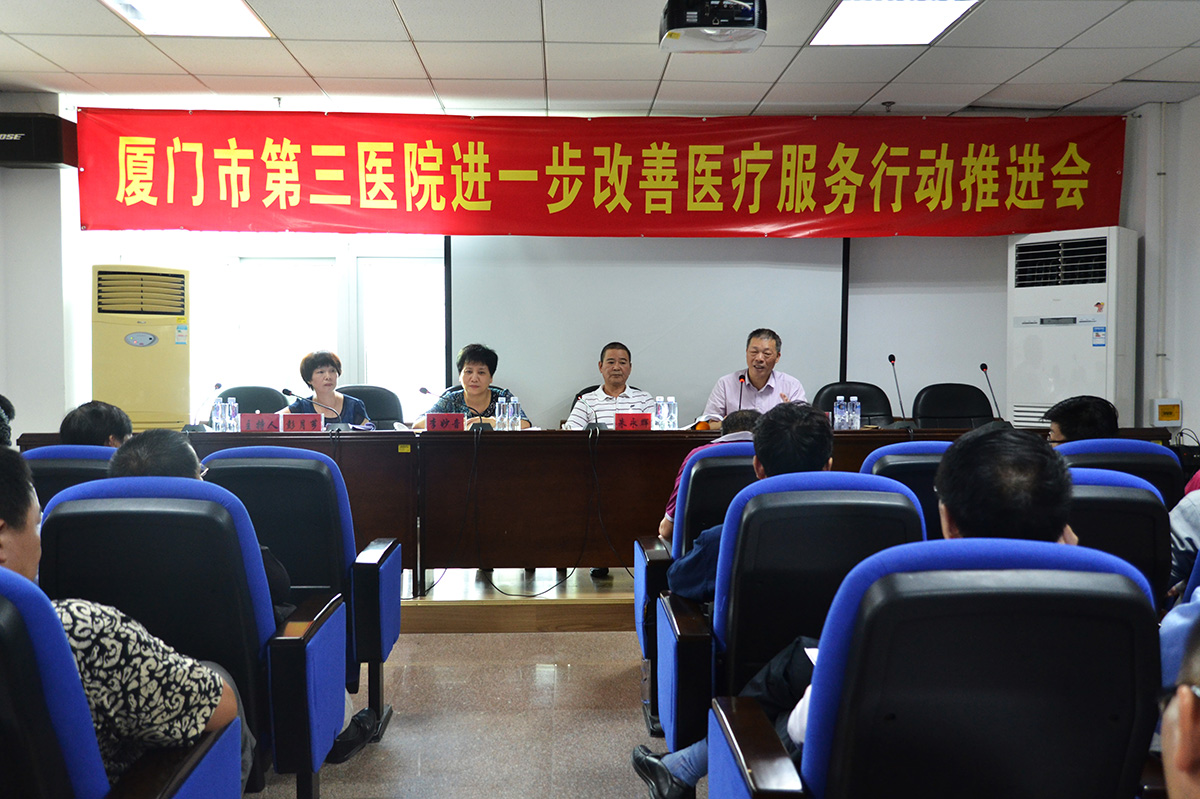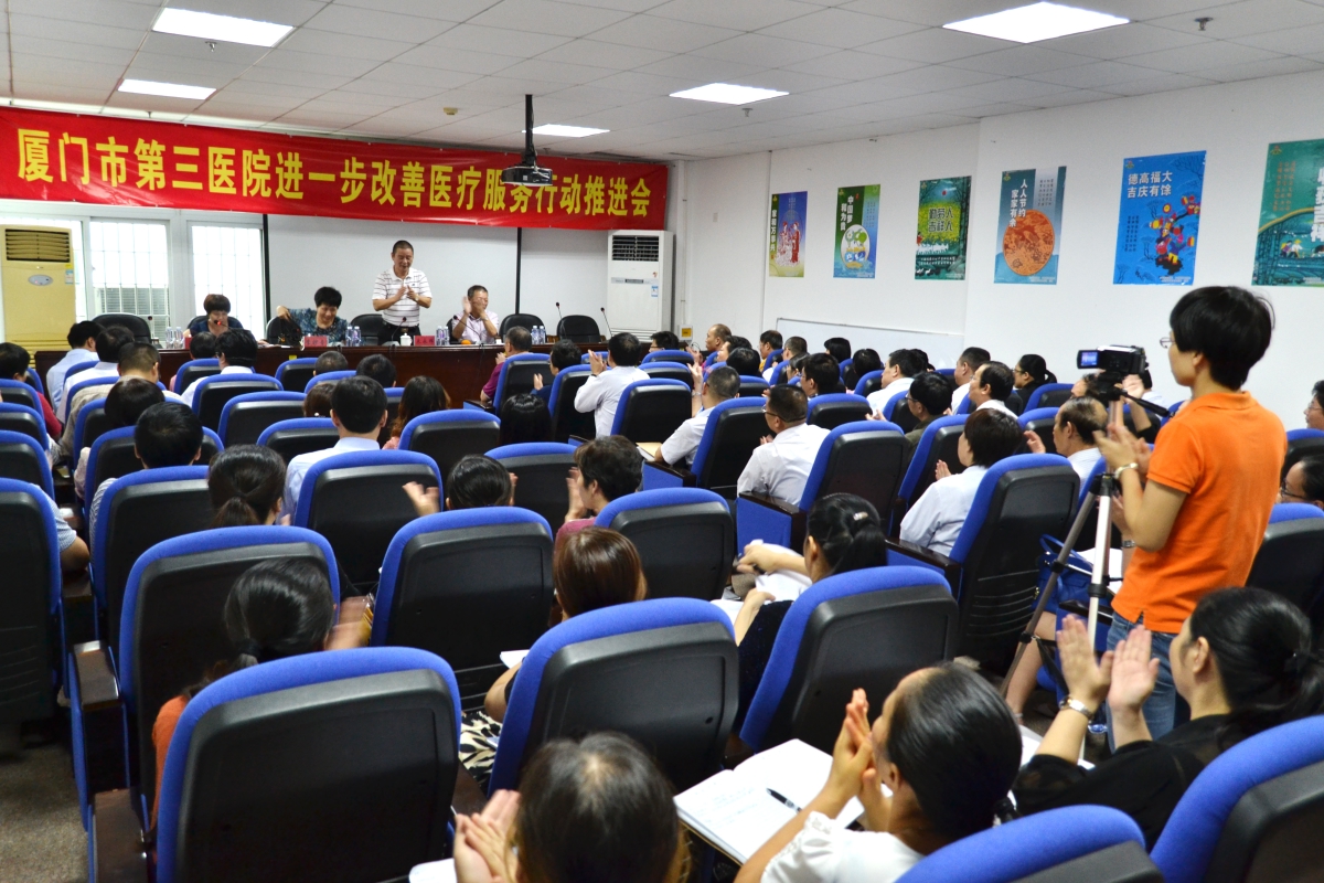 区卫计局局长李妙音在会上强调,今天的会议不仅仅是一个动员会,也是一个推进会。区政府长期对三院的工作非常关心支持,每年均拨出一定的资金投入医疗建设。肯定了第三医院近年来在开展三好一满意、三改两推一评议等活动中所取得的成绩,离不开全体员工不辞劳苦,默默奉献,勇攀医学高峰所作出的不懈努力,为保障全区医疗卫生工作做出了积极贡献。在肯定成绩的同时,也对三院提出了更高的要求。强调要正视问题,尤其是要把进一步改善医疗服务三年行动计划作为今后一段时间医院的工作重点,要以此为契机,促进医院内涵建设,更加注重人文关怀,改变管理模式,努力营造便捷安全有效明白就医的服务环境。第一,要提高认识,全员参与,全面提高医疗服务队伍的形象。第二,要加强组织领导,指定专门部门负责组织协调,要有时间安排进度表,督促检查工作的落实。第三,要强化协调配合,切实解决问题。以问题为导向,以改善人民群众看病就医感受为出发点,围绕群众看病就医感受反映最强烈最突出的问题,在提升服务环境、优化服务流程、改善服务态度,提高服务质量上下功夫,要动真格要全员参与,做到无盲区、无特区、全覆盖。在活动中,抓好四个着力点:一是着力优化服务环境,切实打造温馨舒适的就医环境,关心医务人员的生活,营造安心放心舒心的工作环境,做到群众、职工双满意;二是着力提升服务流程,切实改善病人的就医感受。急病人之所急,想病人之所想,提高服务的可及性,让患者少排队少跑腿少奔波少折腾;三是着力解决导向问题,突出公立医院的公益性;四是着力提升医疗服务,确实加强医疗服务管理,减少医疗纠纷。要鼓励医务人员潜心钻研业务,提升业务水平,确保诊疗治疗合理对症。要加大宣传力度,树立典型,把医德好服务好技术好的医务人员宣传好,通过他们带动医院带动全区卫生系统更好地发展。第四,强化责任,注重整改,列出时间表、线路图,确保进一步改善医疗服务行动计划的落实。第五,要注重总结提高,注重建立长效机制,从基本入手,从最基层的科室入手,从基础改起,一点一滴地抓起,一项一项地去改善。