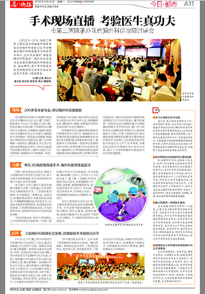 全省胸外科学术活动由三院承办,说明三院具备坚实基础和浓厚学术氛围,为全省各地同行交流搭建了良好平台,省内外专家学者相互切磋,展示省内各医院近几年成绩,有利于看齐全国领先水平。三院有着近百年历史,特别近10来年发展相当快,在全省的市级医院处于前列水平。三院胸外科达到了三甲医院水平,院长叶惠龙就是胸外科和普外科的“多面手”,在他带领下,技术力量雄厚,在肺癌、胃癌、食管癌等微创领域颇有建树。