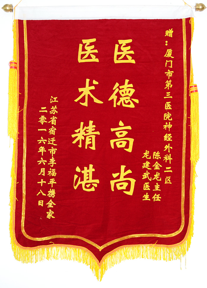 6月27日上午,快递给第三医院送来了一份特别的礼物,打开一看,原来是从江苏省宿迁市寄来的两面锦旗。其中一面锦旗是赠送给神经外科二区陈金龙主任、龙建武医生,称赞他们“医德高尚、医术精湛”,另一面赠送给叶淑莹护士长及全体护理人员,称赞她们“精心护理、热情服务”。