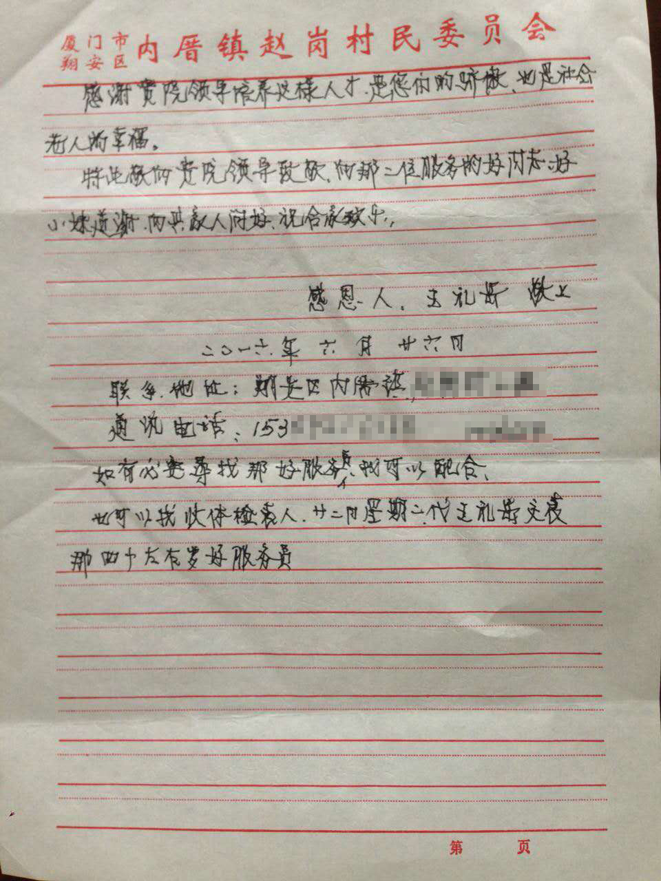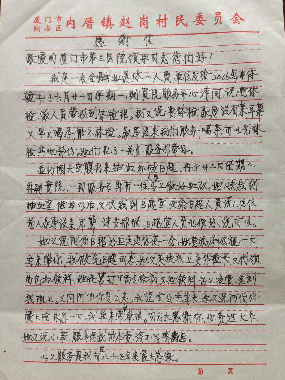 耄耋老人亲笔书写感谢信,大力赞扬三院优质服务