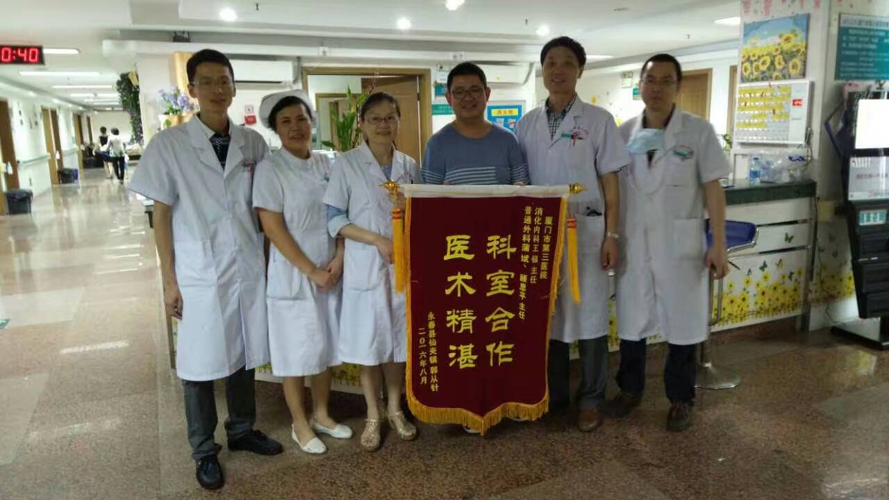 患者郭先生来自泉州永春,62岁,因患结肠癌晚期并广泛转移,入住市第三医院普外科。普外科、肿瘤科、放射科、超声影像科、消化内科、麻醉科等多科协作,为郭先生会诊、讨论,制定详细周密的治疗方案,普外科为郭先生行手术解除肠梗阻,肿瘤科会诊化疗;后因肿瘤压 迫胆管导致胆道梗阻重度黄疸,肝胆外科医师予以PTCD外引流,消化内科予以鼻胆管、胆管支架及胰管支架内引流等多学科给力,使得郭先生的病情迅速好转,达到最佳的治疗效果,病人及家属由衷感谢。