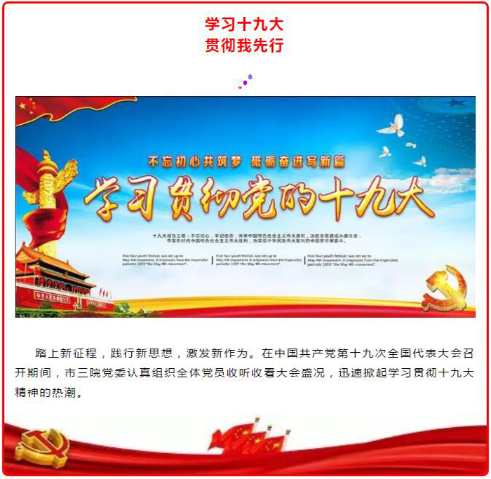 十九大闭幕后,医院党委又及时将党的十九大精神传达到各支部,统一订购十九大精神学习用书,确保全院党员人手一册。通过集中学习、专题座谈、制作宣传栏、通过网络平台、微信平台推送等,进一步推动全体党员干部认真学习、准确把握、深刻领会、坚决贯彻党的十九大提出的新思想、新论断、新使命、新蓝图、新部署、新要求,把思想和行动统一到党的十九大精神上来,让每位党员切实学懂弄通做实,努力在新时代开启新征程续写新篇章。