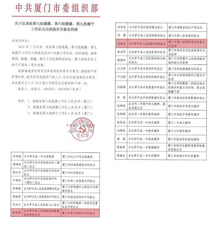 结合10月份和11月份的主题党日活动,开展“学习十九大,贯彻我先行”及“五抓五重”的专题讨论,要求每一位党员、干部都要提高政治站位,切实增强“四个意识”,自觉用党的十九大精神作为一切行动的指南。10月份以来,医院党员干部、职工在工作中充分发扬勇于担当、主动作为、真抓实干、敢于创新的敬业精神,用实际行动赢得了群众的赞誉,共收到锦旗9面,感谢信1封,他们在不同的岗位上为党旗添光彩。如医院保卫科帮助一名粗心大意的病人找回她走丢的孩子,病人感激地送上了感谢信,由衷感谢保安人员及妇产科医务人员。还有一些援藏援疆援外的党员医务工作者,他们克服区域困难,用爱和责任诠释对生命的尊重,用大爱和无畏树立了厦门医生的良好形象。其中徐华英、吴德忠两位同志还获得省卫计系统记功奖励。
