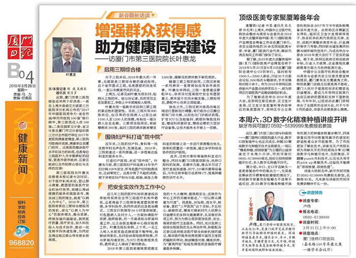 第三医院院长叶惠龙在接受本报记者专访时说,对于医疗机构来说,要让群众满意,最重要的是医疗安全和治疗效果,再辅以周到便捷的服务和就医条件,落实到三院的理念,就是“以病人为中心”。2018年,第三医院将抓住三期综合楼投用的契机,深化“以病人为中心”的服务理念,整合资源,持续加强内涵建设,狠抓医疗质量、医疗安全,加大科技投入与技术协作,推动一批优势学科快速发展,为同安及周边地区群众带来更多获得感。