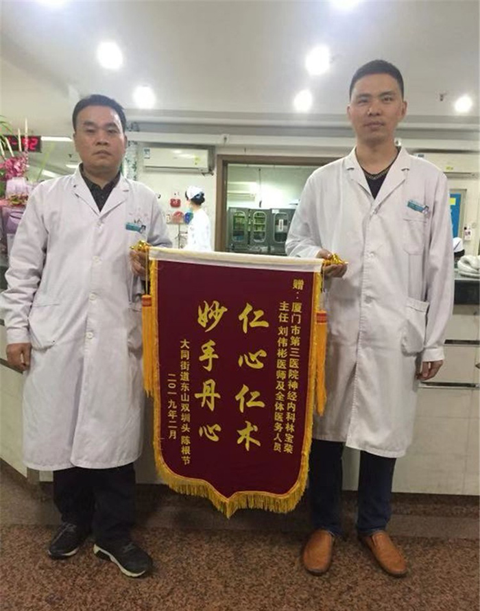 “市第三医院的医生们医术精湛,妙手回春,情系患者,正如这面锦旗所写的‘仁心仁术,妙手丹心’,感谢您们将我的父亲成功抢救回来,让他的生活基本恢复正常。”老陈的女儿感激不尽,为市第三医院ICU、神经内科主任医师林宝荣及刘伟彬等全体医护人员送上了锦旗,以表敬意、谢意。