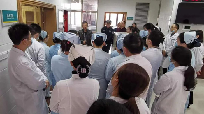 医院保卫科科长邢剑文讲解了火灾现场的应急处置方案、灭火器与消防栓的使用方法以及相关的注意事项。随后,医院保安员示范了如何利用消防栓接水灭火,医务人员还现场模拟了火情发生时自我防护以及应急疏散逃生。