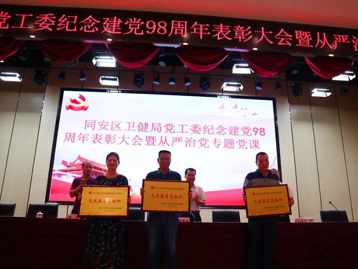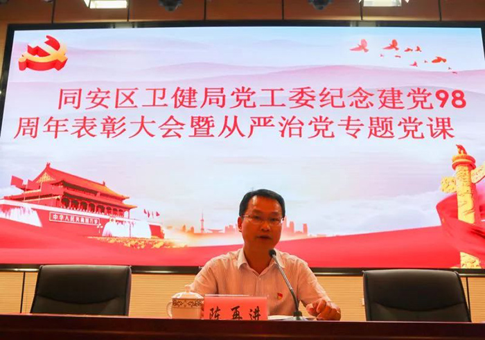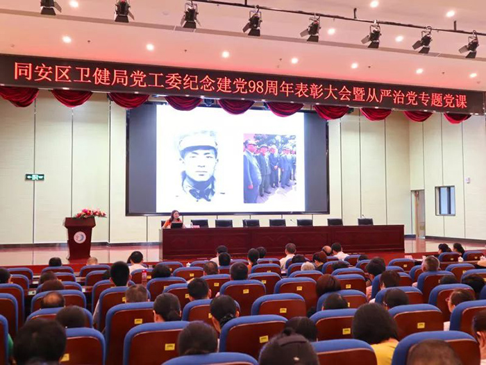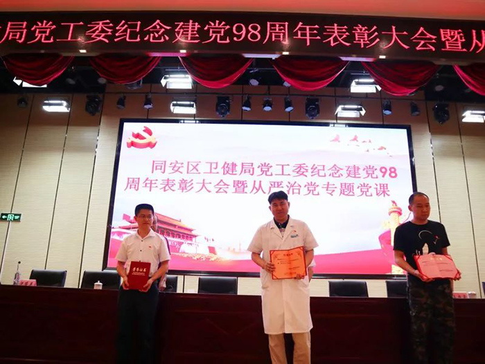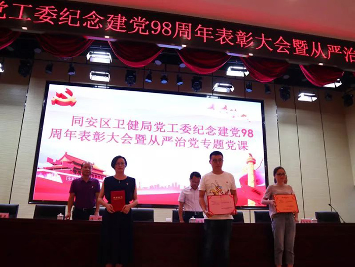 日前,同安区卫健局党工委纪念建党98周年“两优一先”表彰大会暨从严治党专题党课在市第三医院三楼学术报告厅举行,跳蛋视频 一批优秀共产党员、优秀党务工作者获得表彰。